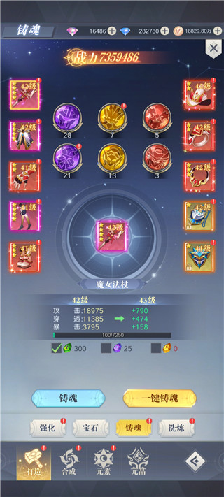 直接铸魂:进入各装备的页面均有一键提升功能自动消耗所需材料对应的铸魂石