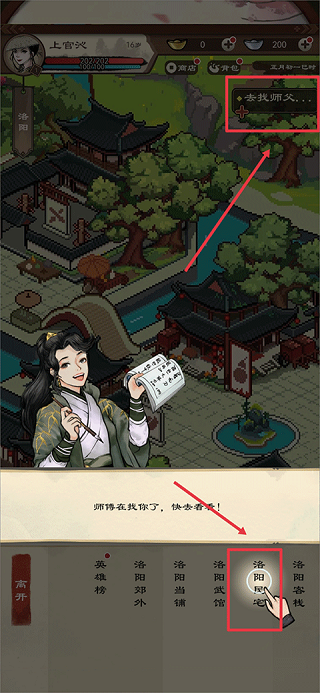 2、然后根据右上角任务完成目标,例如去找师傅,点击洛阳民宅