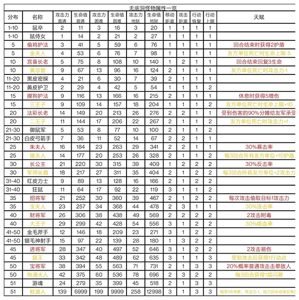 僵尸老鼠:1行动,1步距,近战,天赋:攻击时20%概率击晕敌人。初始3攻击,16生命值
